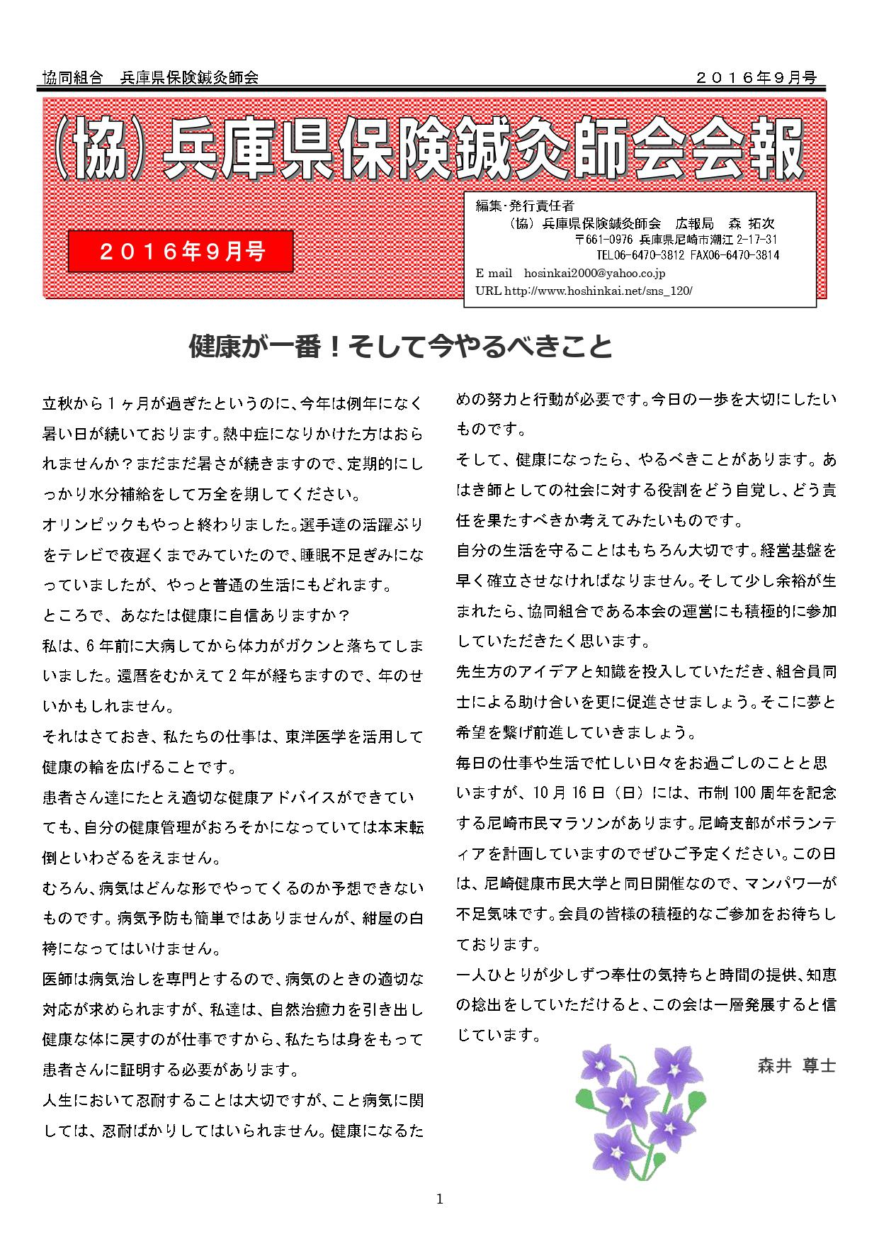 兵庫県保険鍼灸師会会報2016年9月号を発行致しました。健康が一番!そして今やるべきことは…