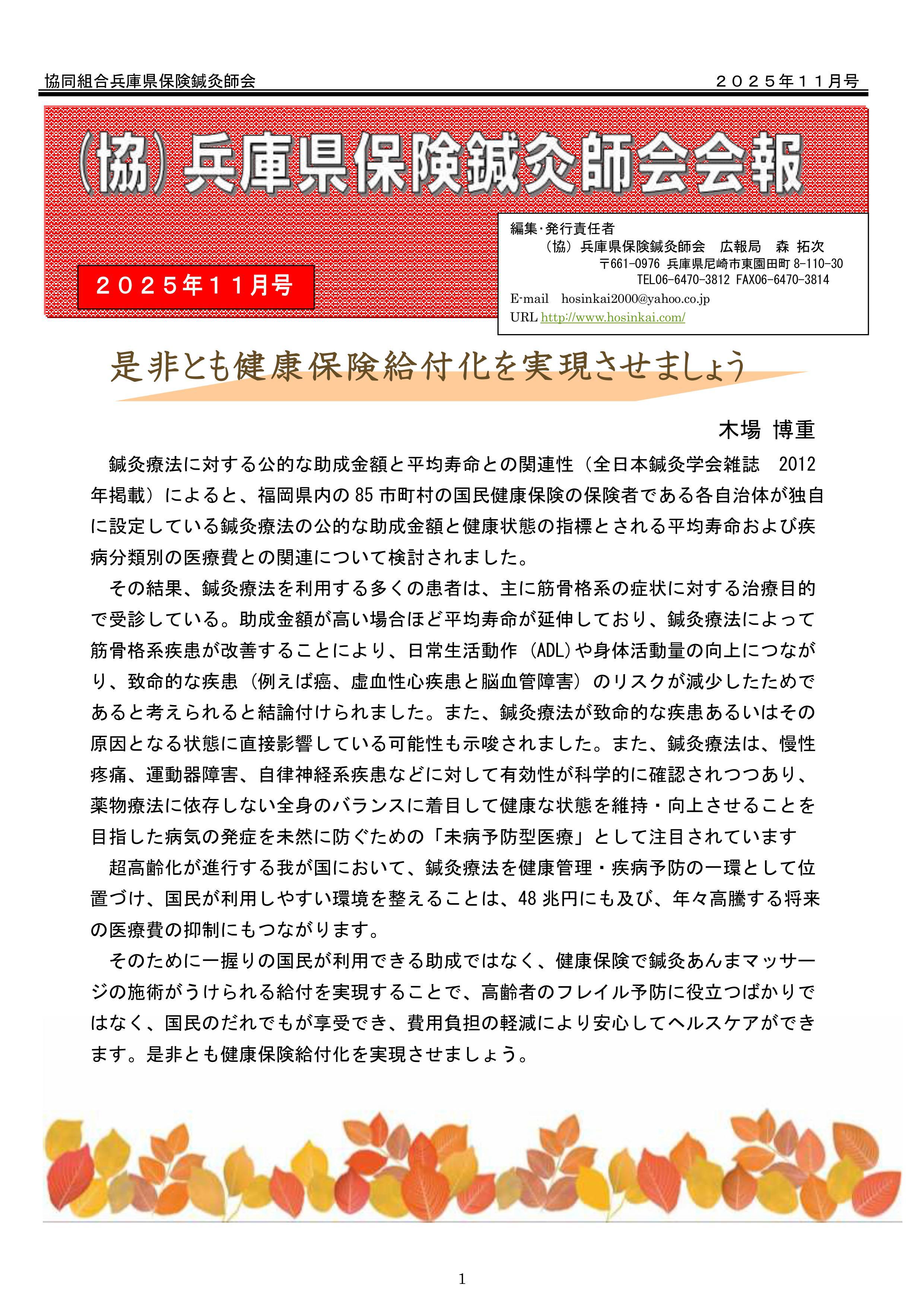兵庫県保険鍼灸師会会報2025年11月号を発行致しました。