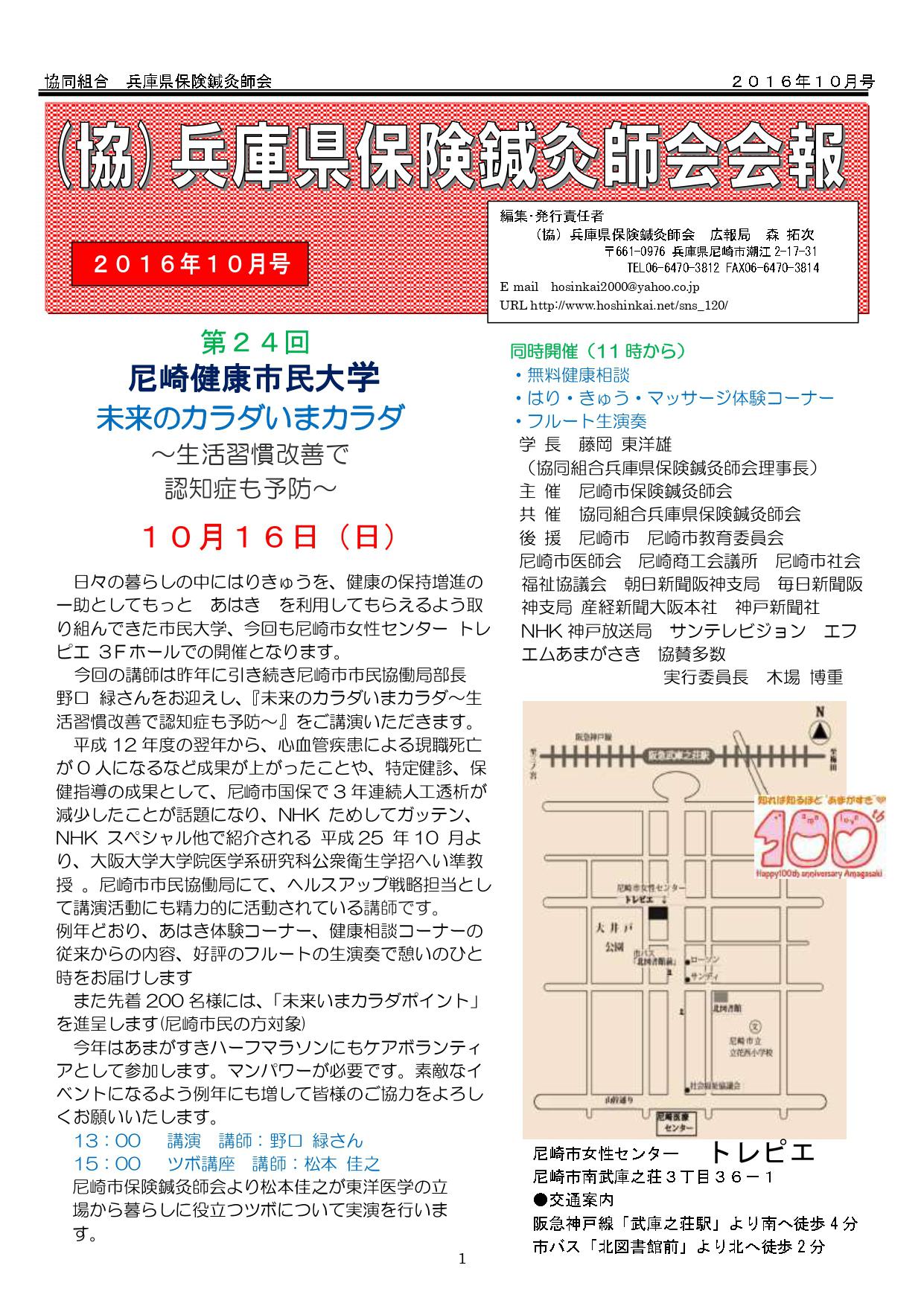 兵庫県保険鍼灸師会会報2016年10月号を発行致しました。第24回尼崎健康市民大学
