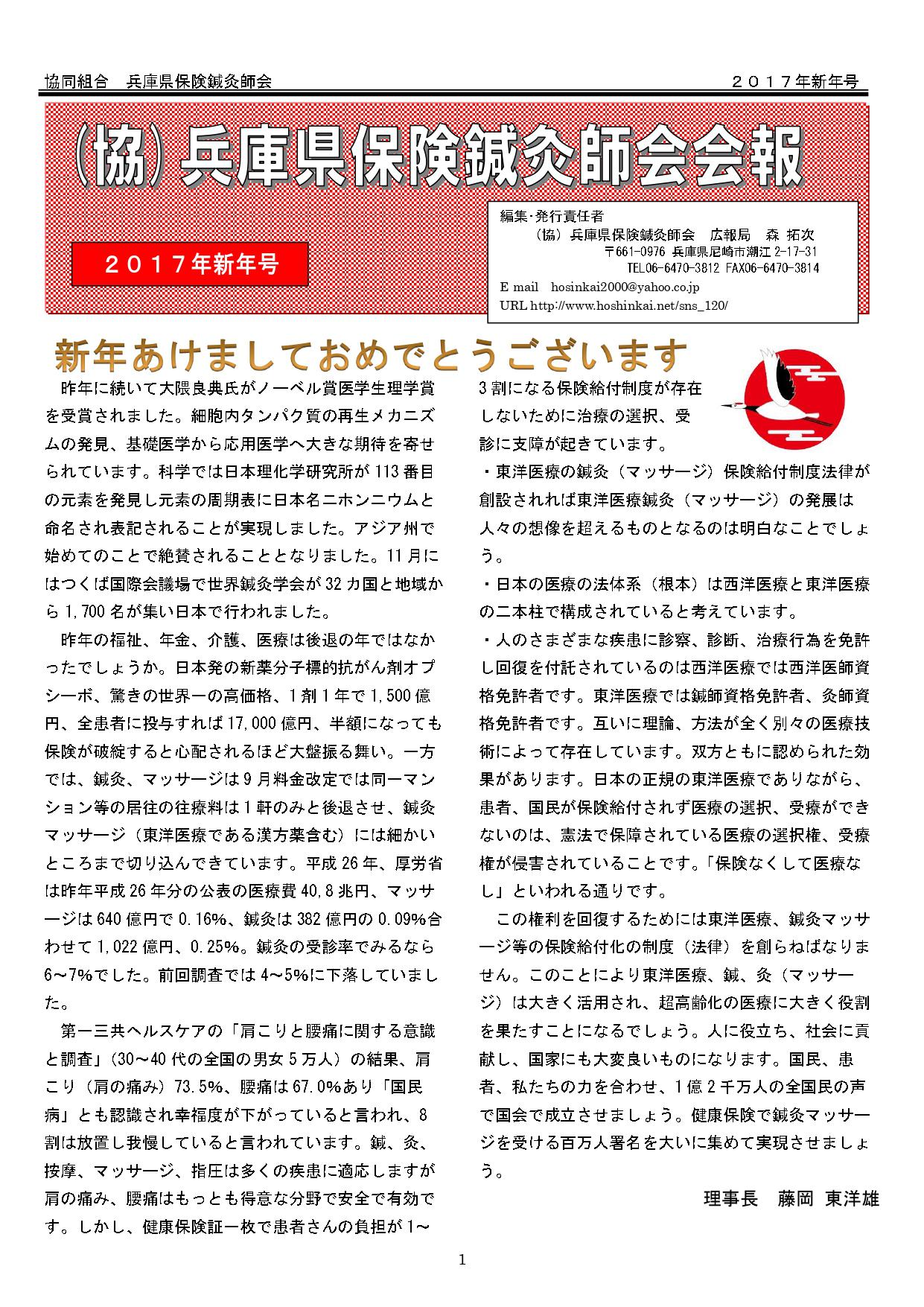 兵庫県保険鍼灸師会会報2017年1月号を発行致しました。「新年あけましておめでとうございます。」